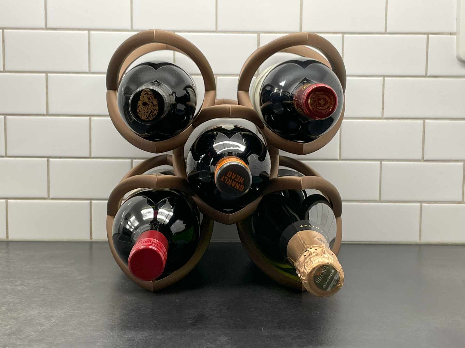 Nosso suporte de vinho para 5 garrafas une design moderno e funcionalidade, sendo ideal para quem deseja organizar e expor seus rótulos favoritos de forma prática e charmosa.